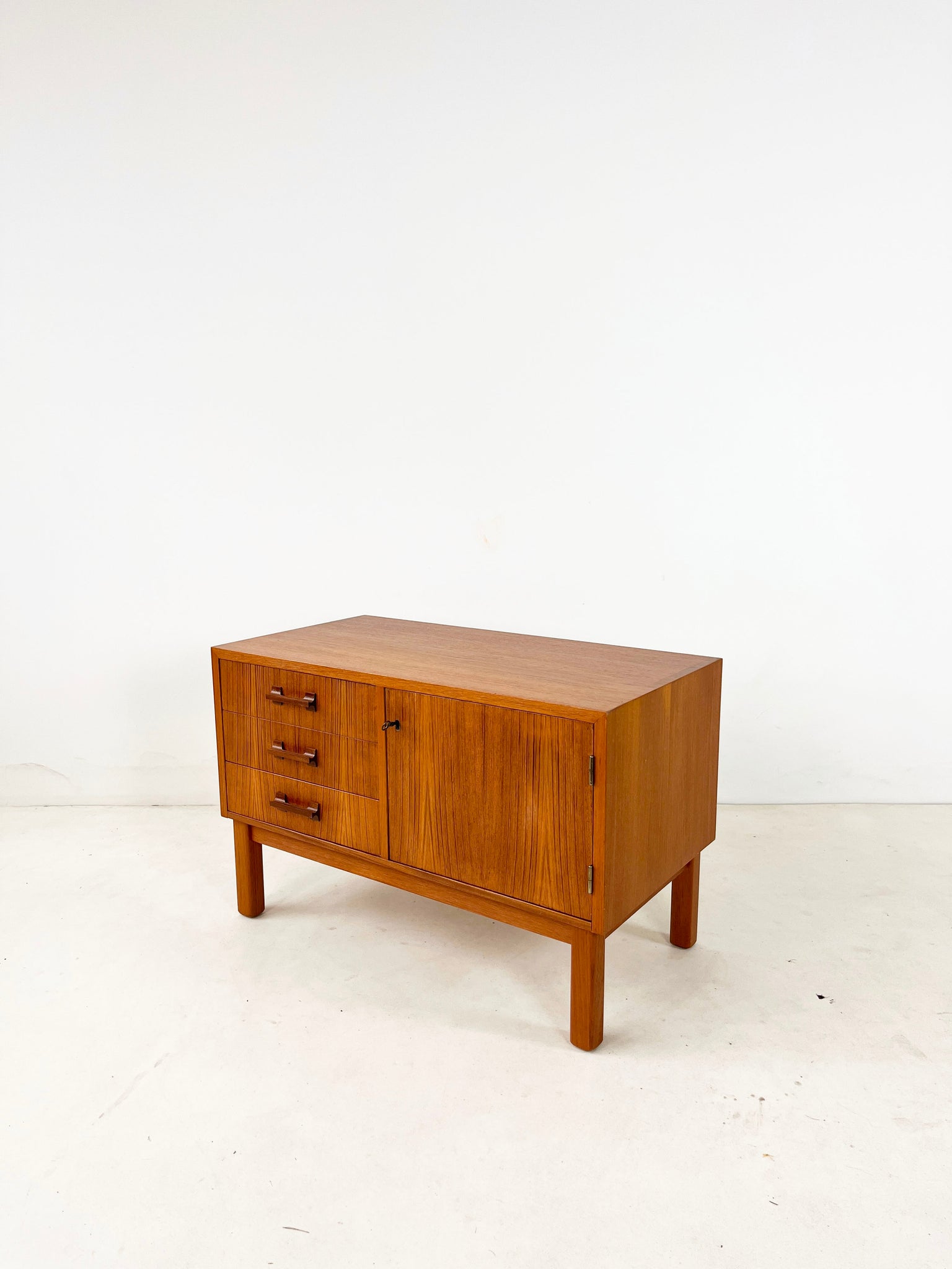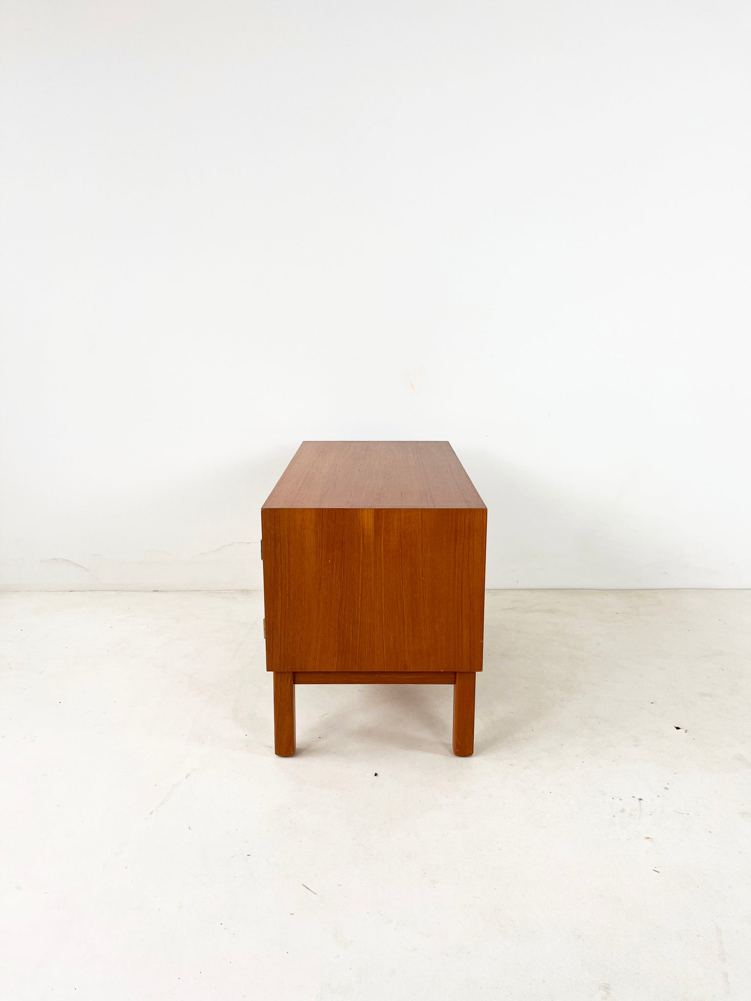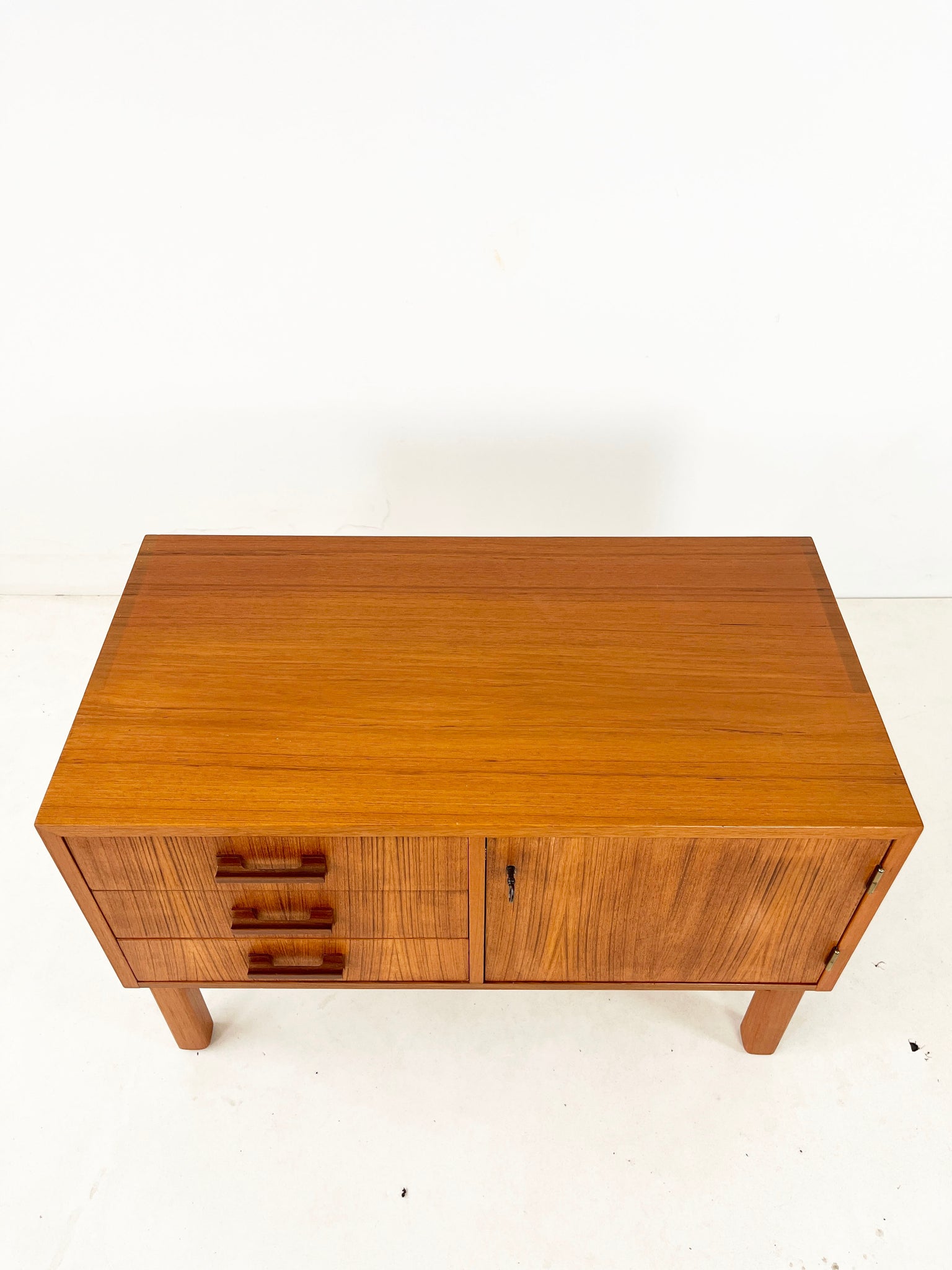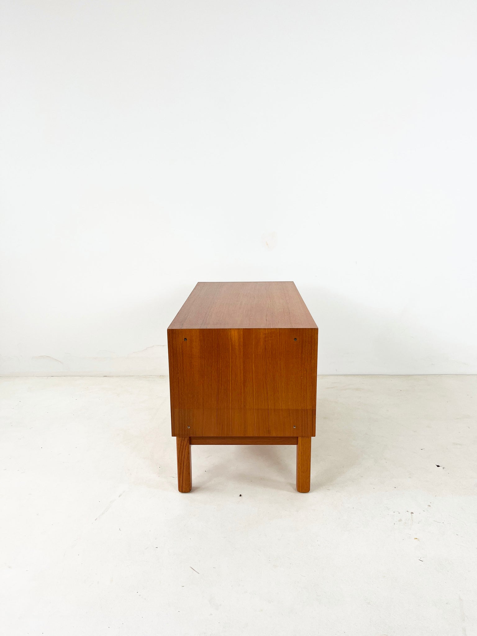 Lage teak opbergkast met mooie grepen, in goede staat. Wat lichtschade aan de bovenkant, zie foto's.