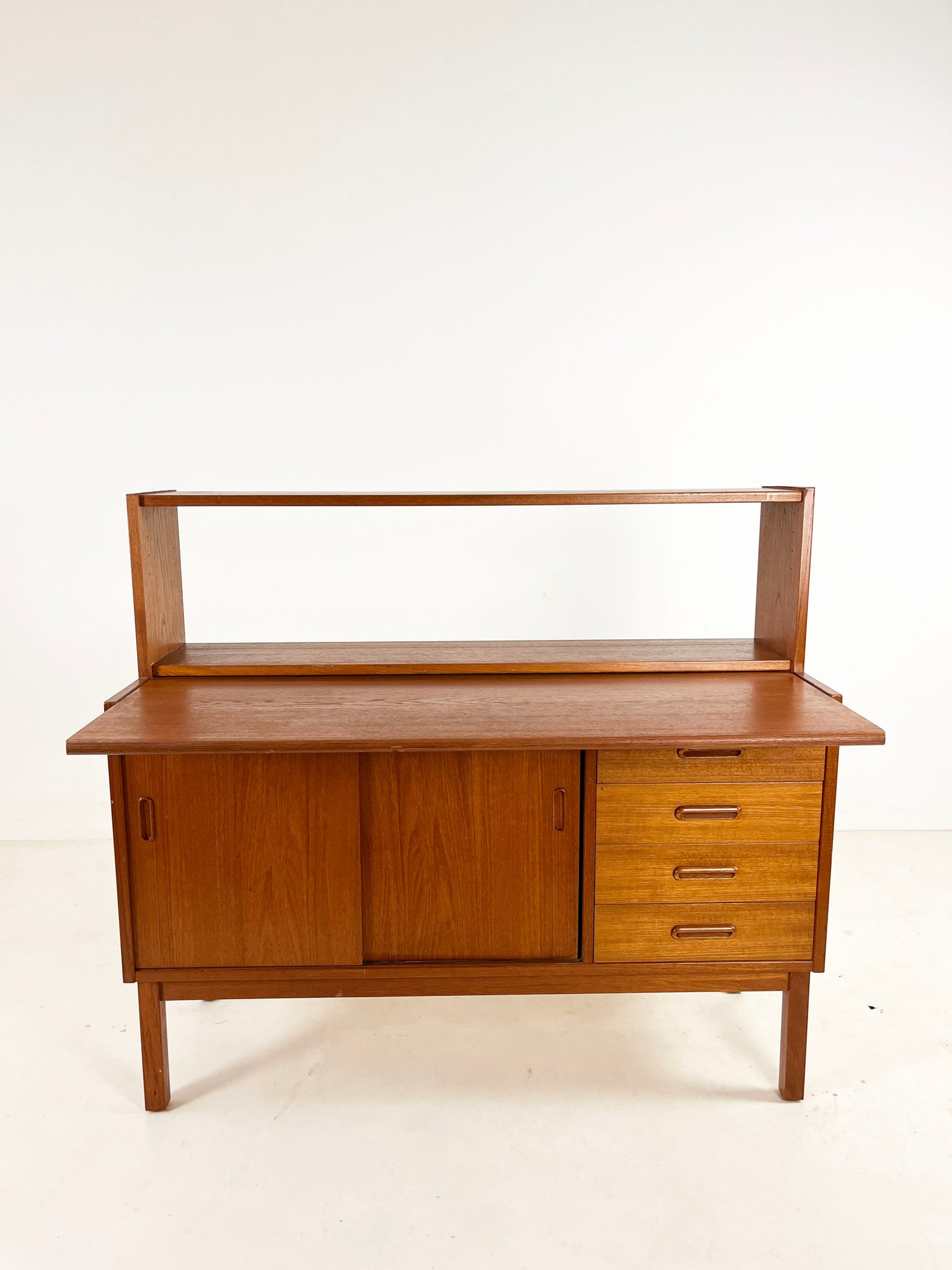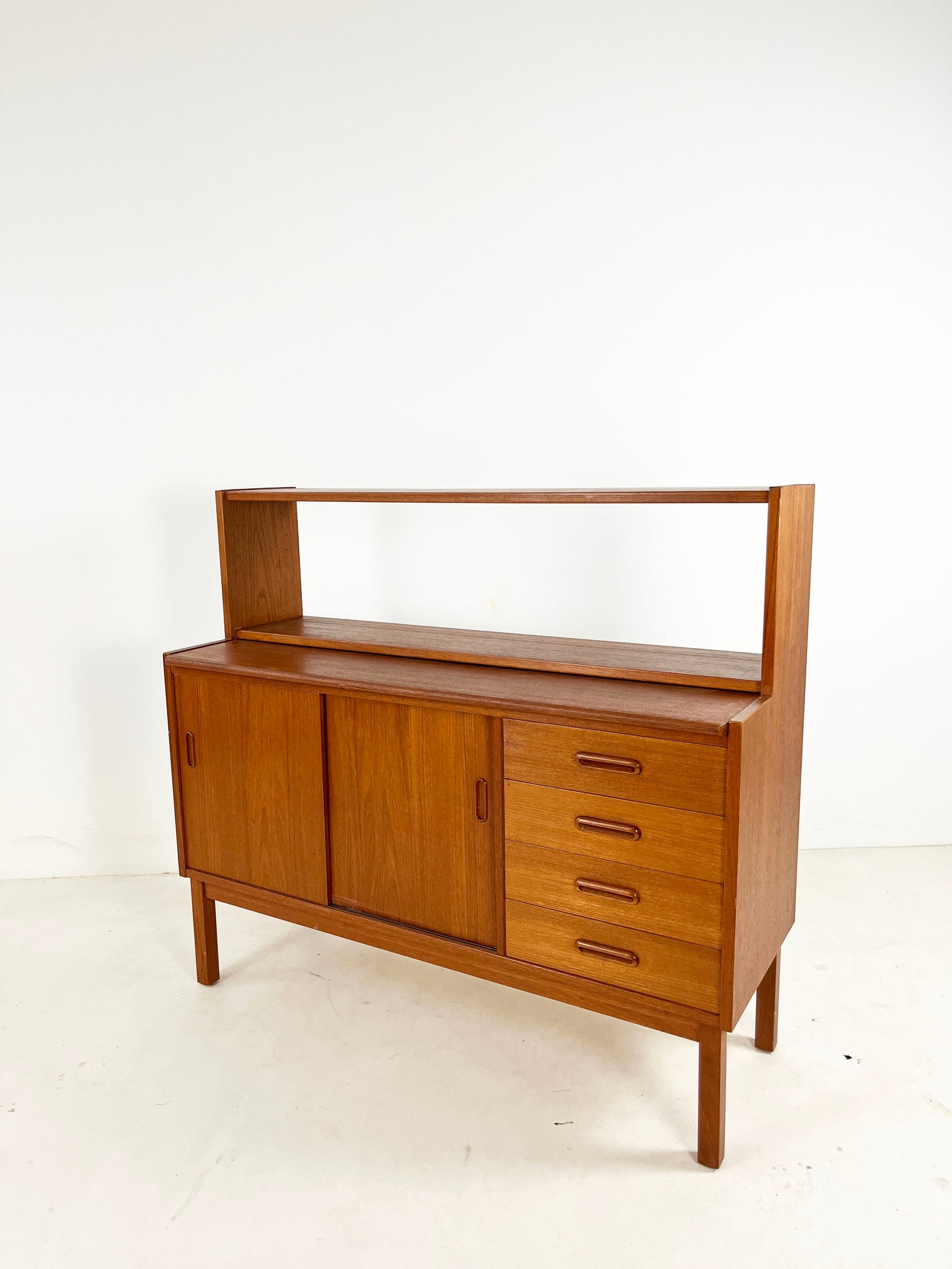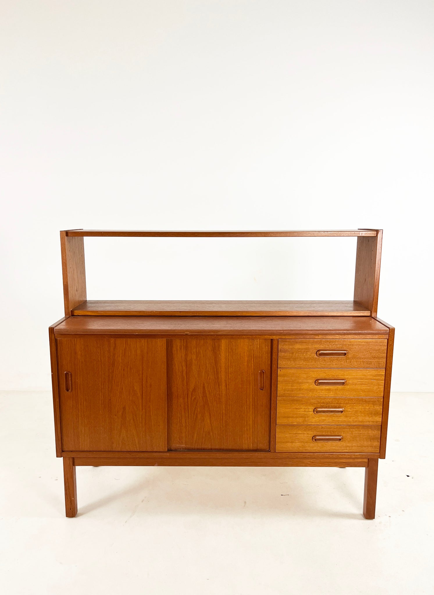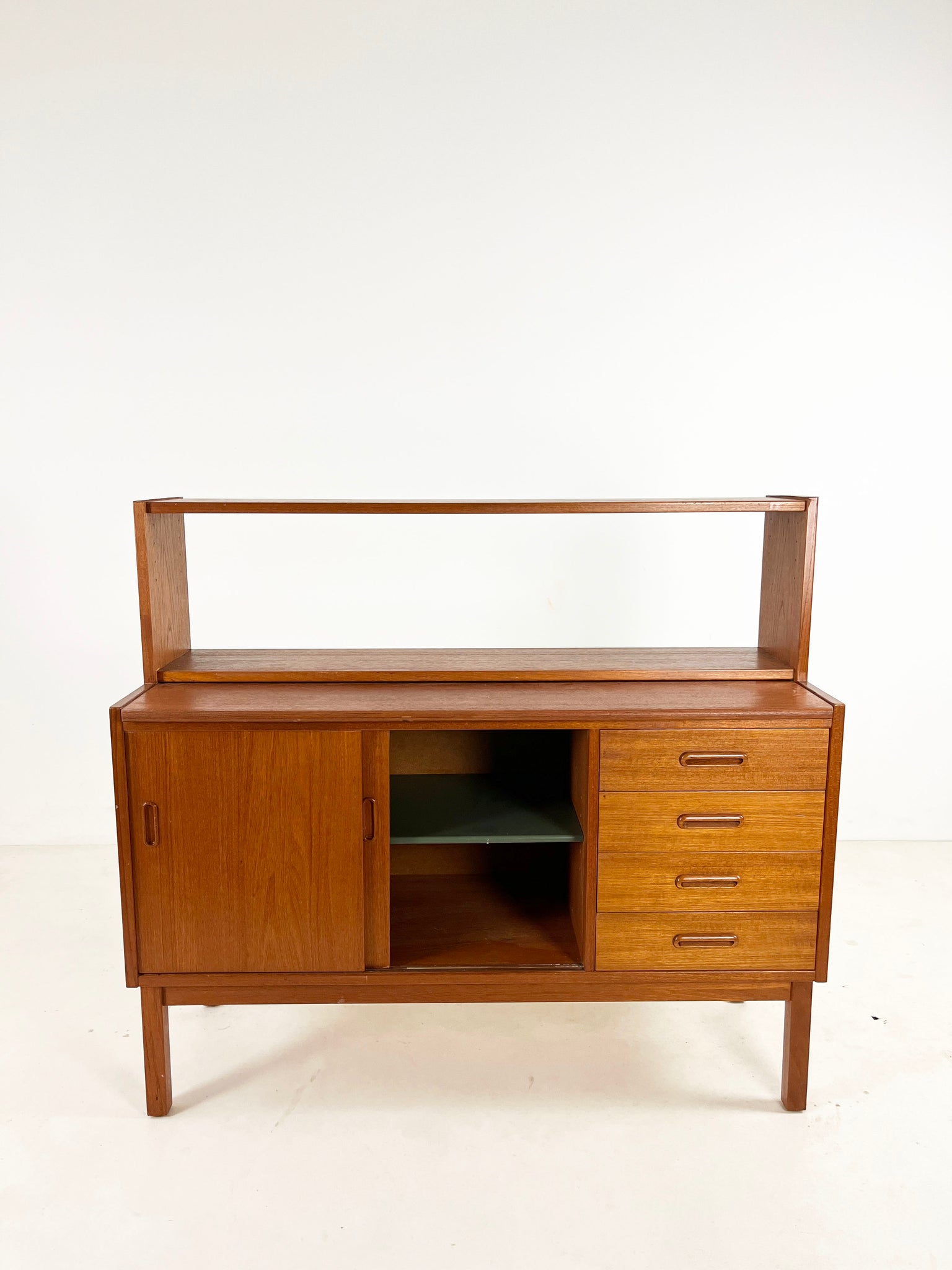 Lovely sideboard/cabinet with an open shelving section. Looks great with a large plant on top and is ideal for making the most of a low space. The top surface is extendable.