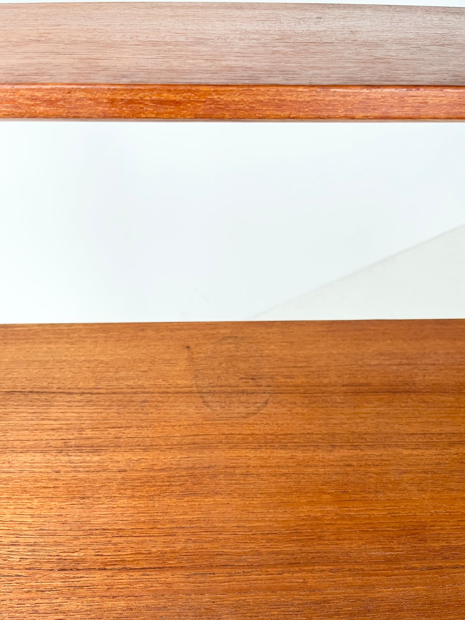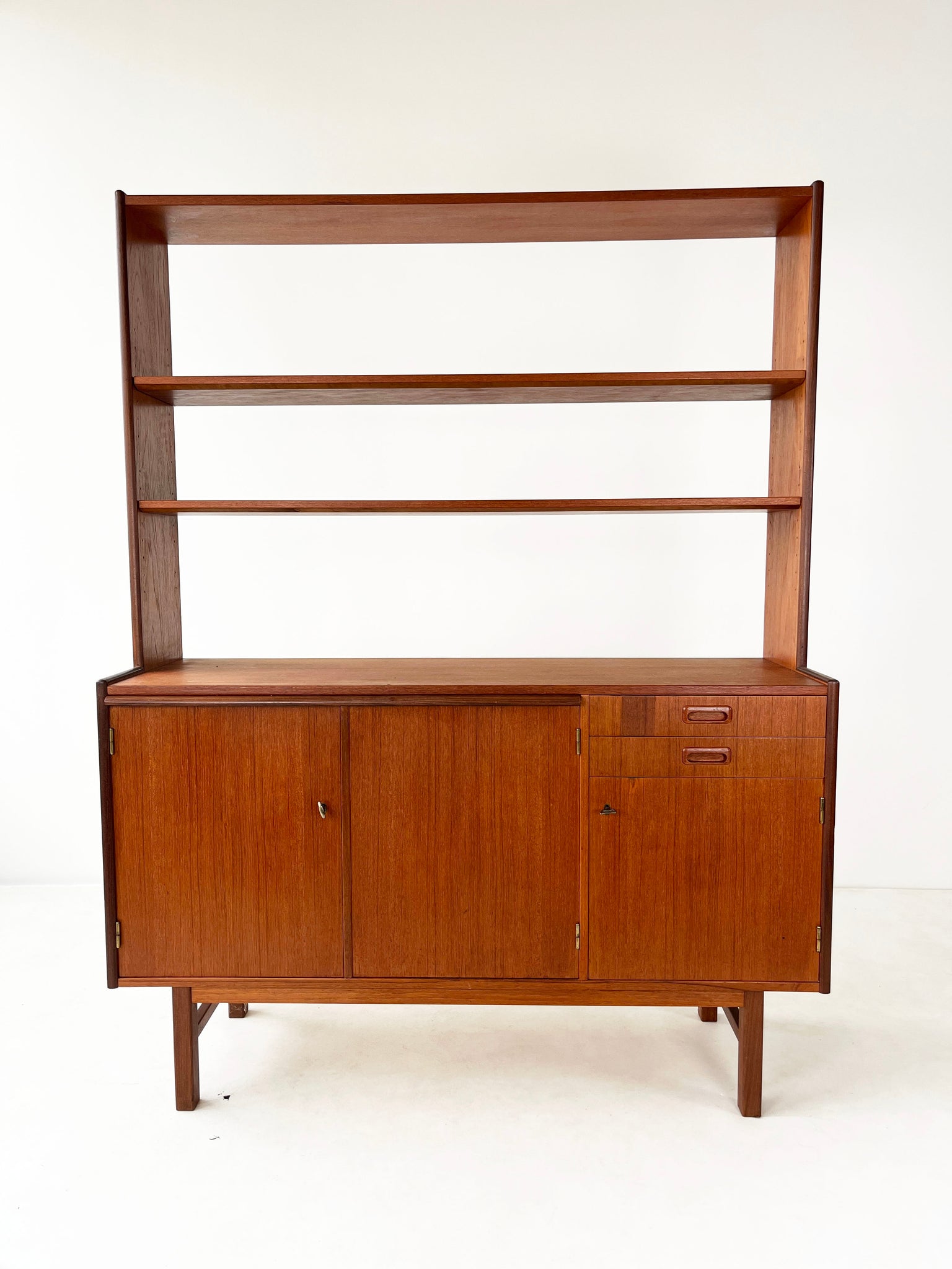 Beautiful bookcase with cabinet, drawer, and shelving sections. The shelves are adjustable, and there is a pull-out shelf at table height. The teak color has a lovely warm tone. A very versatile piece with plenty of storage options.