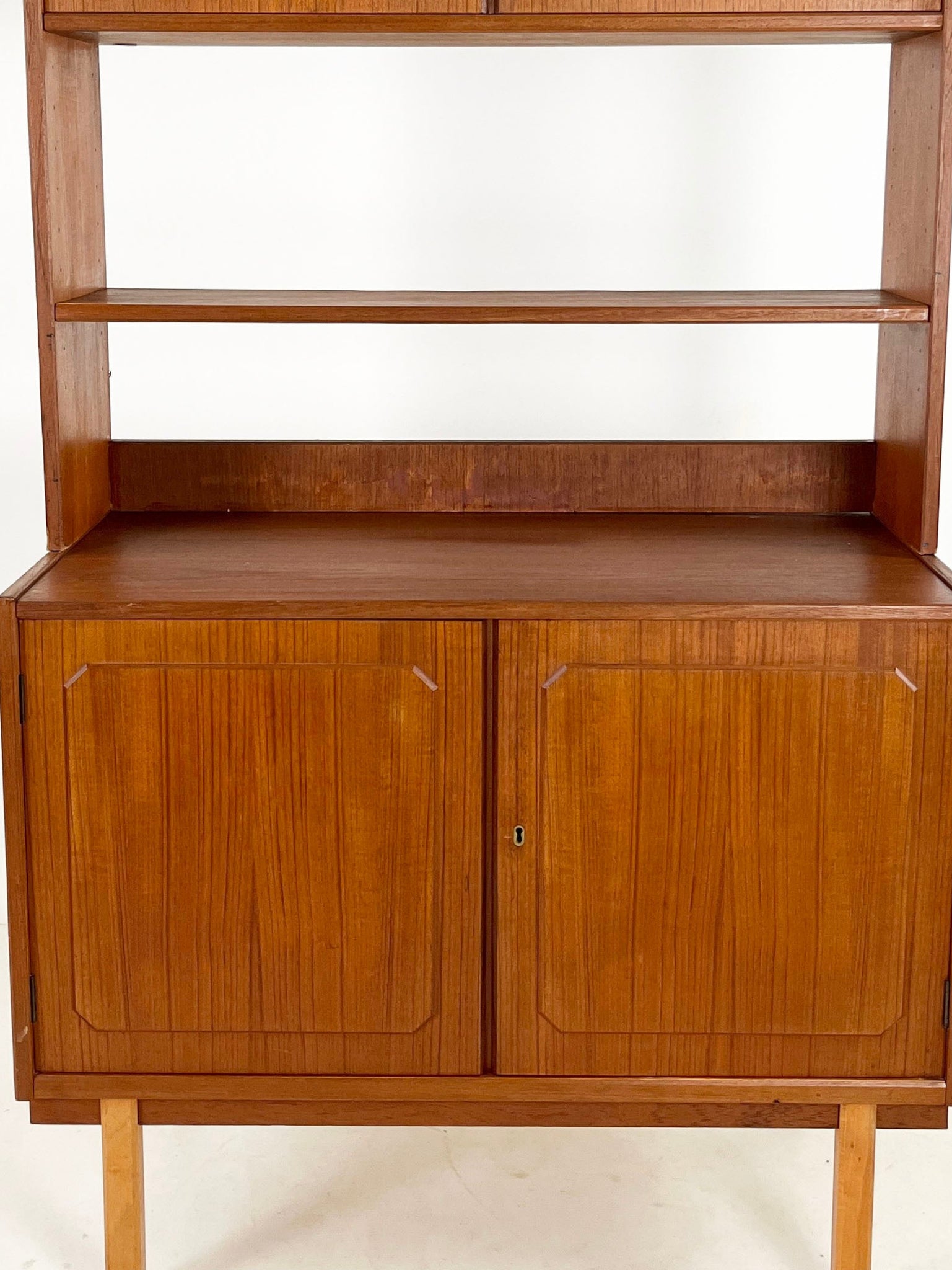 Buffetkast met unieke deuren en een rijke teak kleur. Een prachtig Scandinavisch vintage meubelstuk en een echte toevoeging aan elke keuken of eetkamer. De achterbalk van het open gedeelte is gerestaureerd, en niet in perfecte staat (zie foto of kom langs voor bezichtiging).