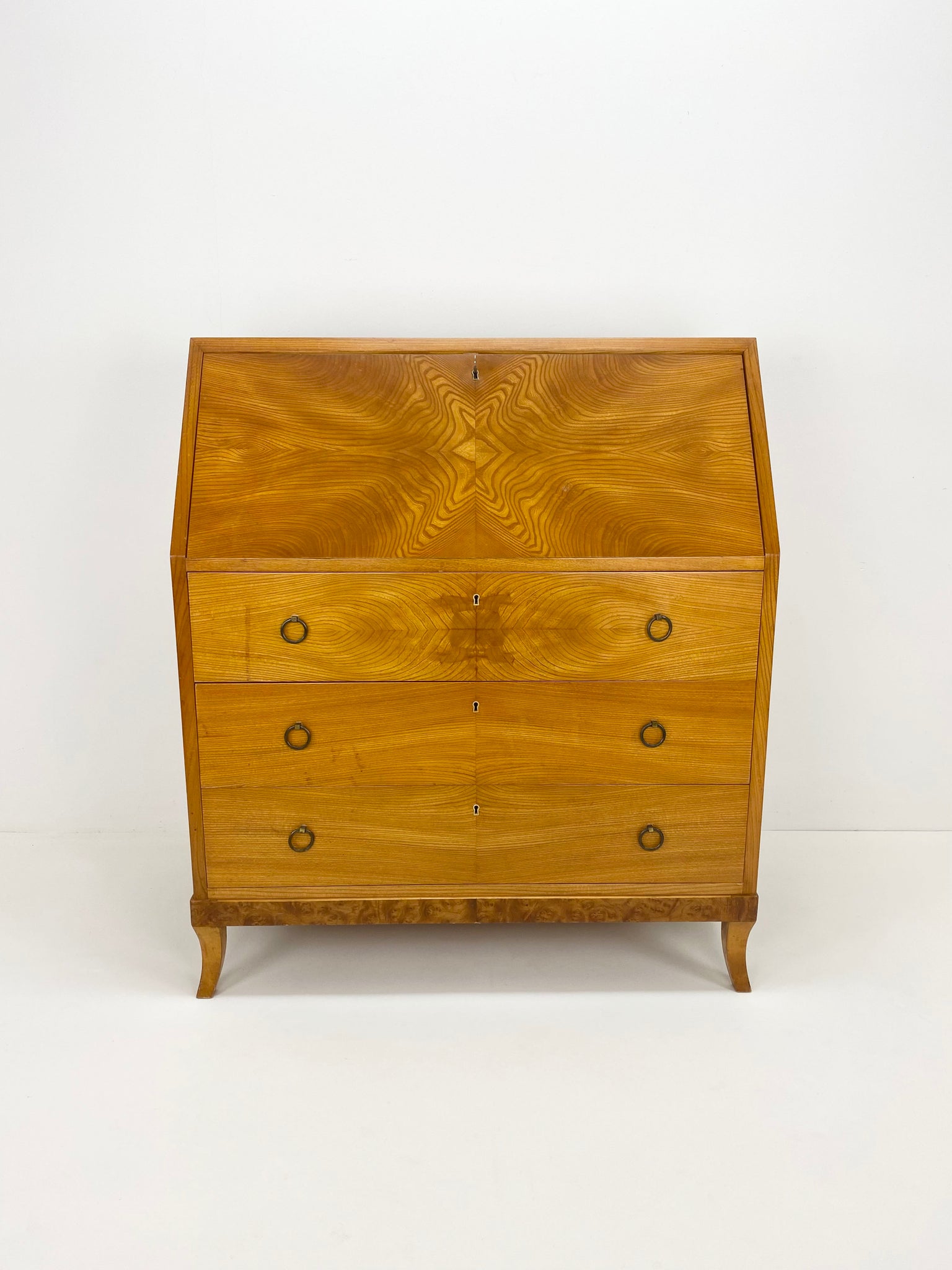 Beautiful desk with beautiful detailing. On the inside, the desk has a great finish on the small drawers. There are a few stains and scratches (see photos). The desk is very sturdy and will last for years to come.