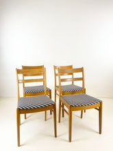 4 eiken eetkamerstoelen (prijs is voor set van 4). Het hout heeft wat gebruikssporen (zie foto's), maar alle stoelen zijn goed en stevig. Stoelen zijn opnieuw gestoffeerd met een mooie stof van goede kwaliteit.