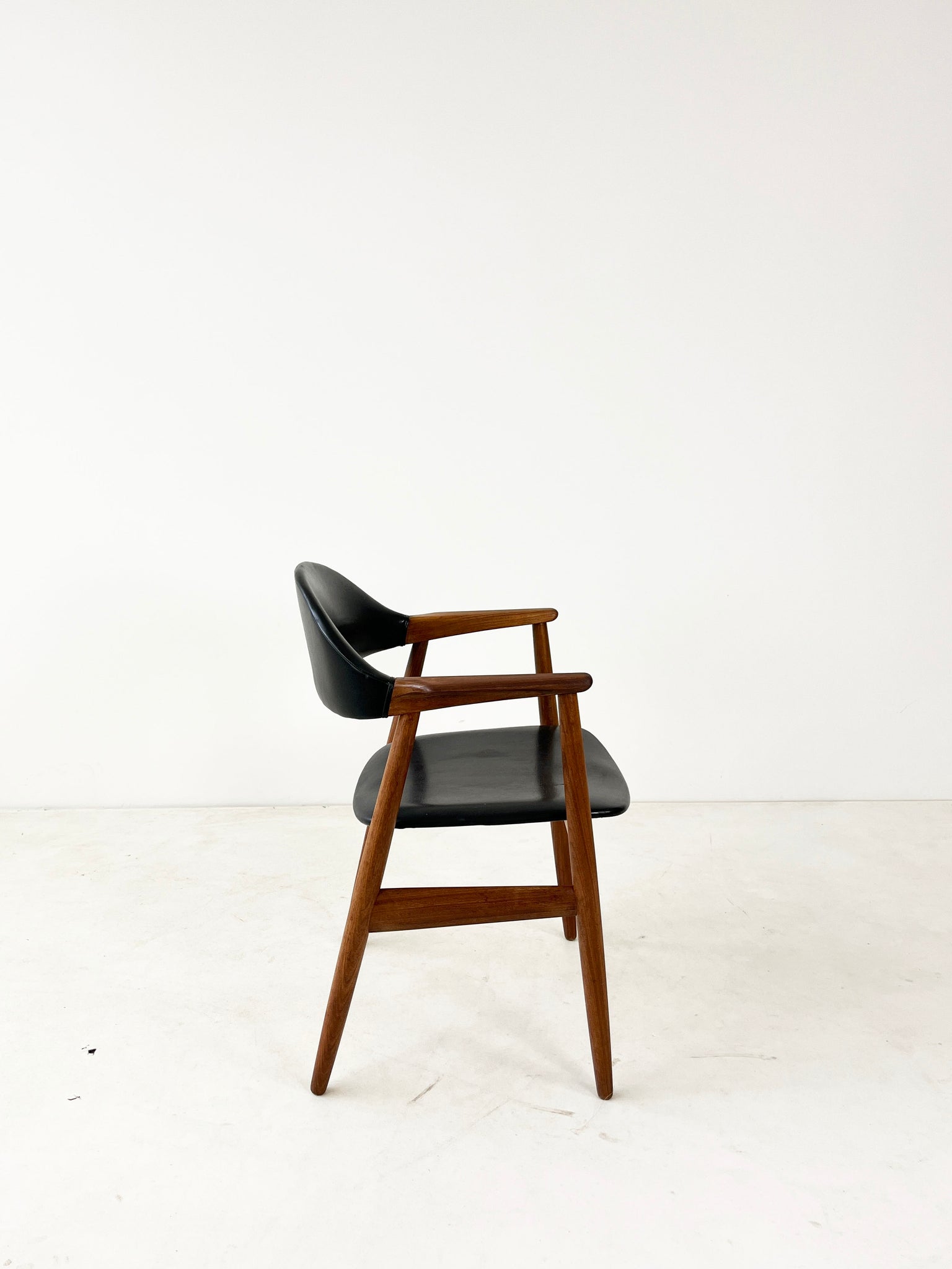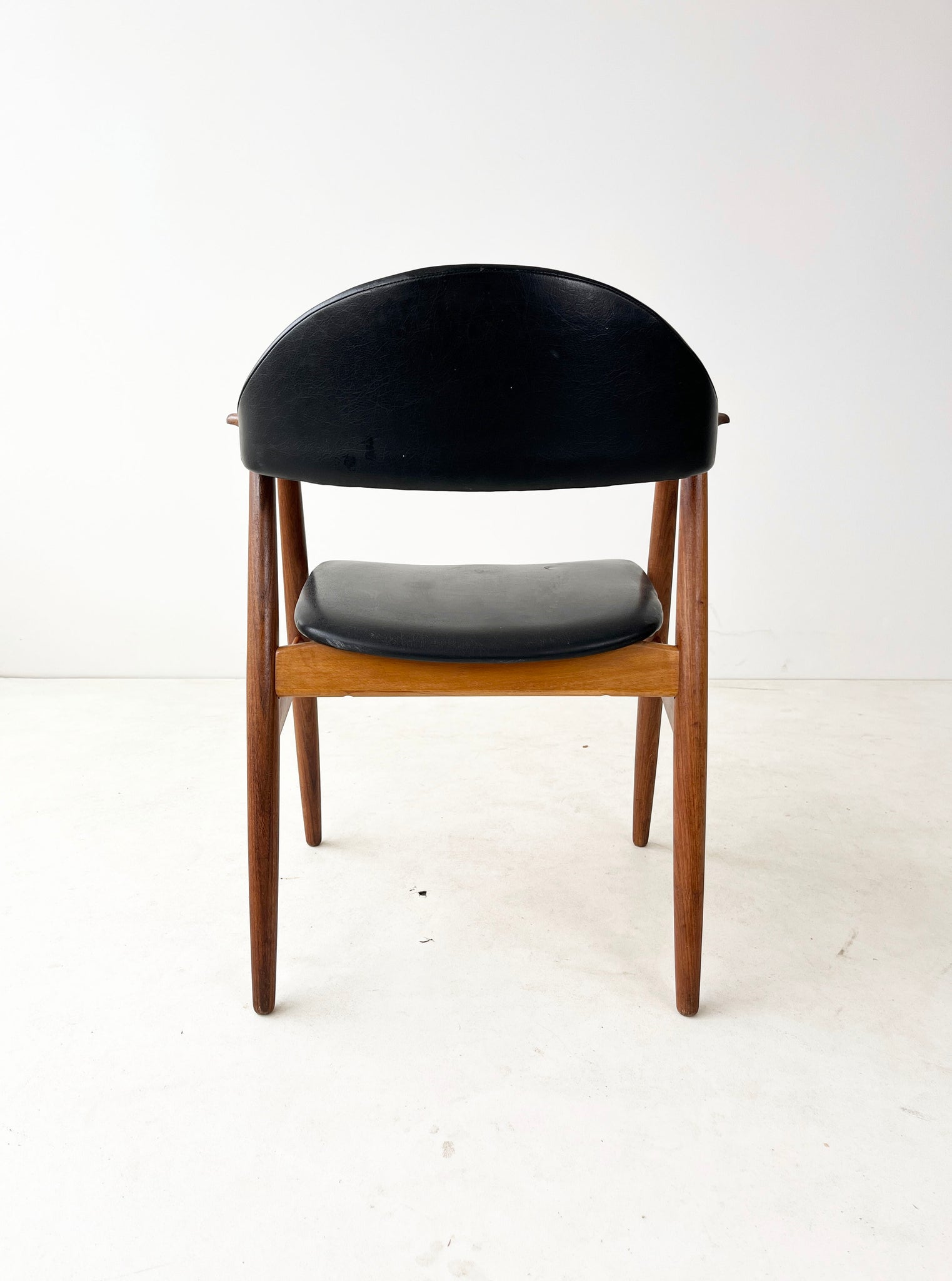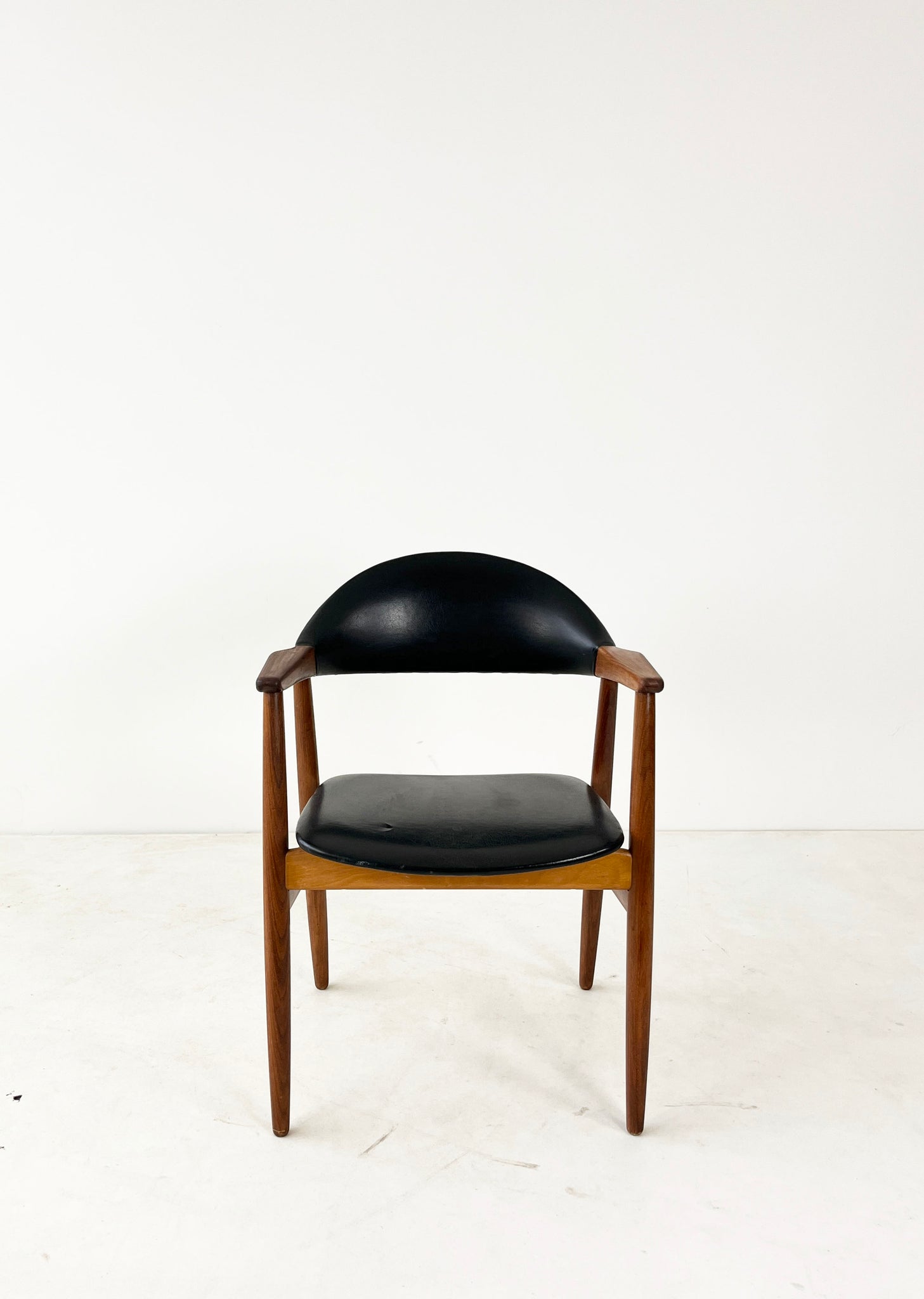 Elegant teak chair with black faux leather seat. Small tear in the leather seat.