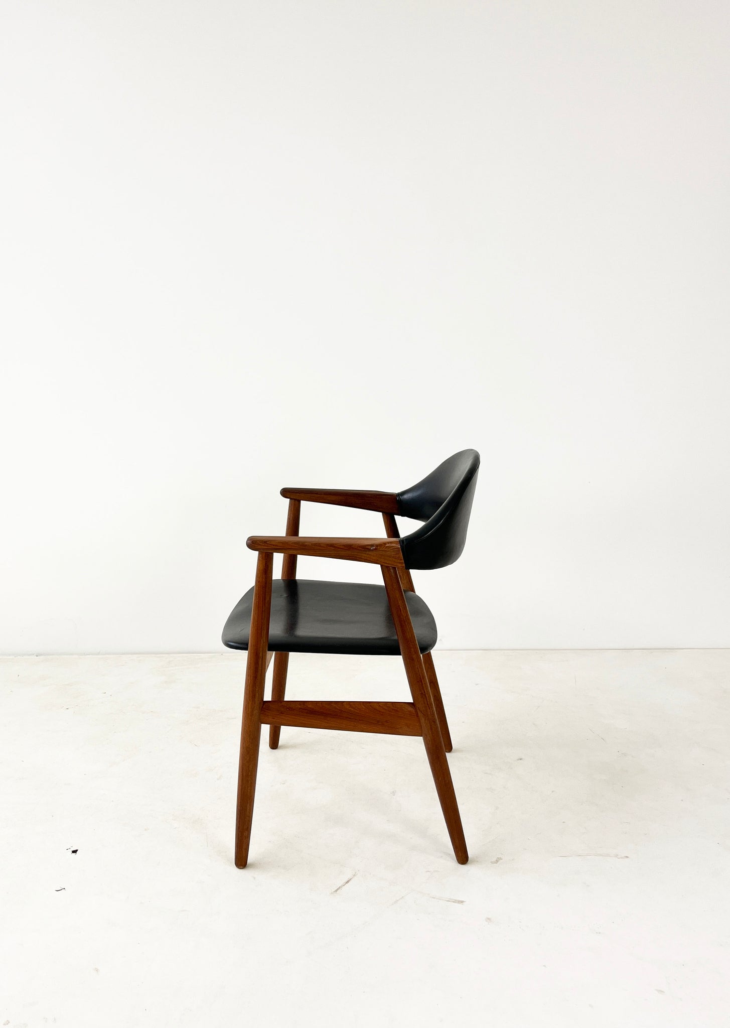 Elegante teak stoel met zwarte skaai zitting. Klein scheurtje in de leren zitting.