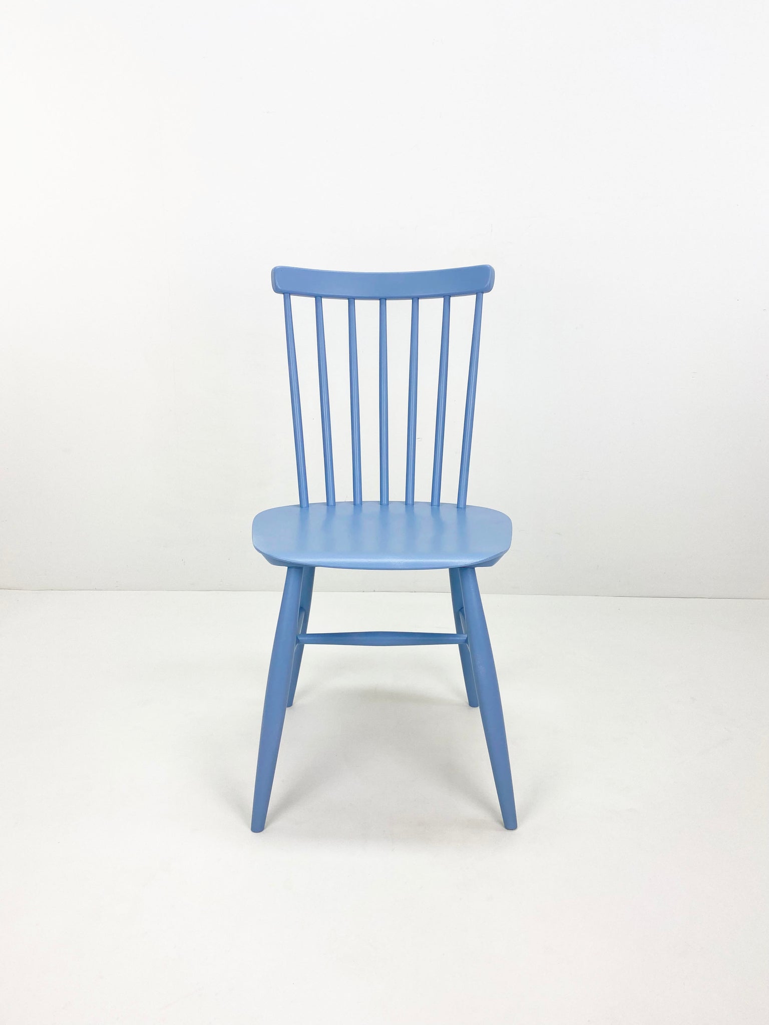 Prachtige spindelstoel(en)! Er is nu 1 beschikbaar en ze zijn allemaal recentelijk professioneel gespoten in deze mooie blauwe kleur. De stoelen zijn erg stevig en stabiel, perfect als je een vleugje subtiele kleur in je interieur wilt brengen. (Prijs per stuk).