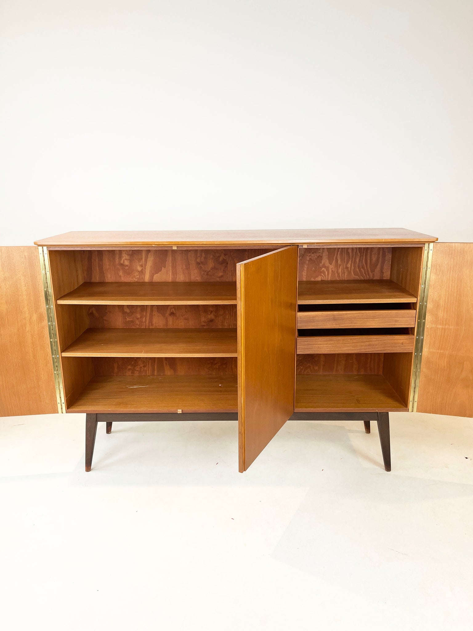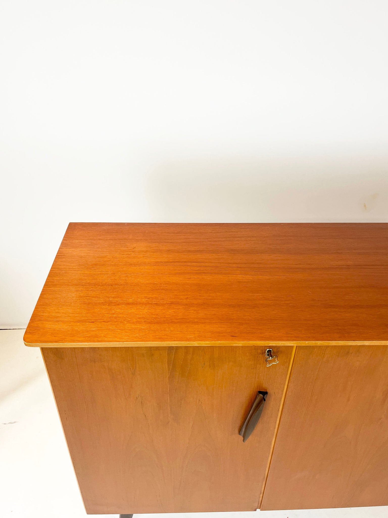 Prachtig vintage teak dressoir / highboard met unieke handgrepen en een strak ontwerp. Gevonden in Zweden. Zeer goede staat, professioneel gerestaureerd.